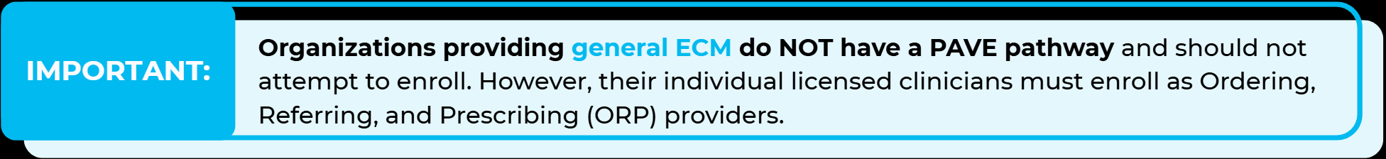 Individual licensed clinicians providing ECM must enroll as Ordering, Referring, and Prescribing (ORP) providers, including: