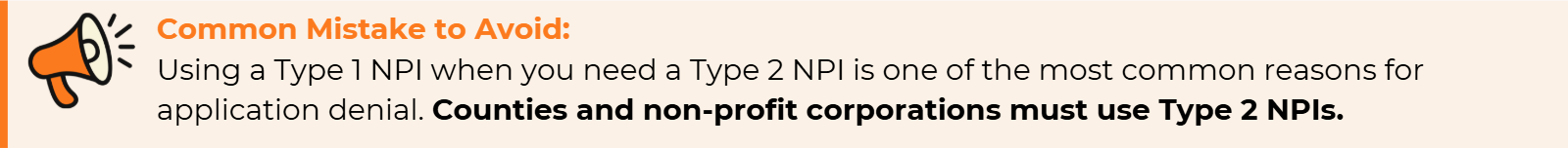 | Type 2 NPI | Organizations | For counties, non-profit corporations, and organizational entities. This is what most CBOs need. |